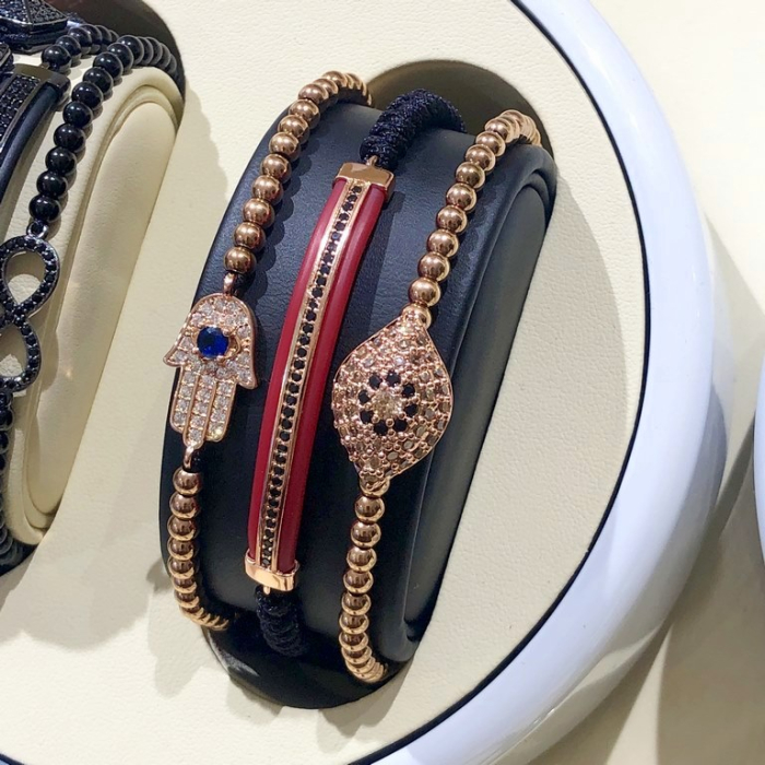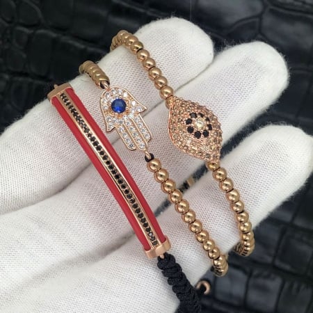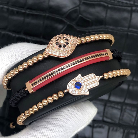 Set 3 Bratari BrooksModele bratari:Pe snur ajustabil.Stil:Dama.Material bile:Otel inoxidabil placat aur rose 14K.Charmuri decorate cu cristale de Zirconiu.Dimensiune bile mici:4 mm.Charmuri:8-10 mm.Setul poate fi purtat la incheieturi cu circumferinta intre 15 si 28 cm.Recomandare: purtata cu alte bratari sau langa un ceas.Bratara vine insotita de cutie."Be different!"