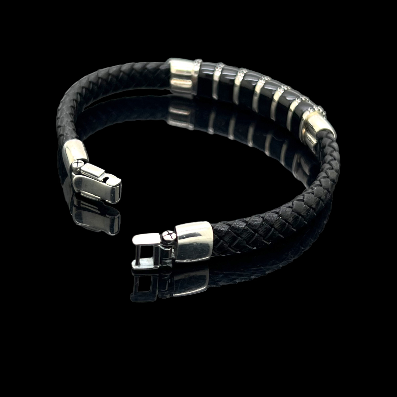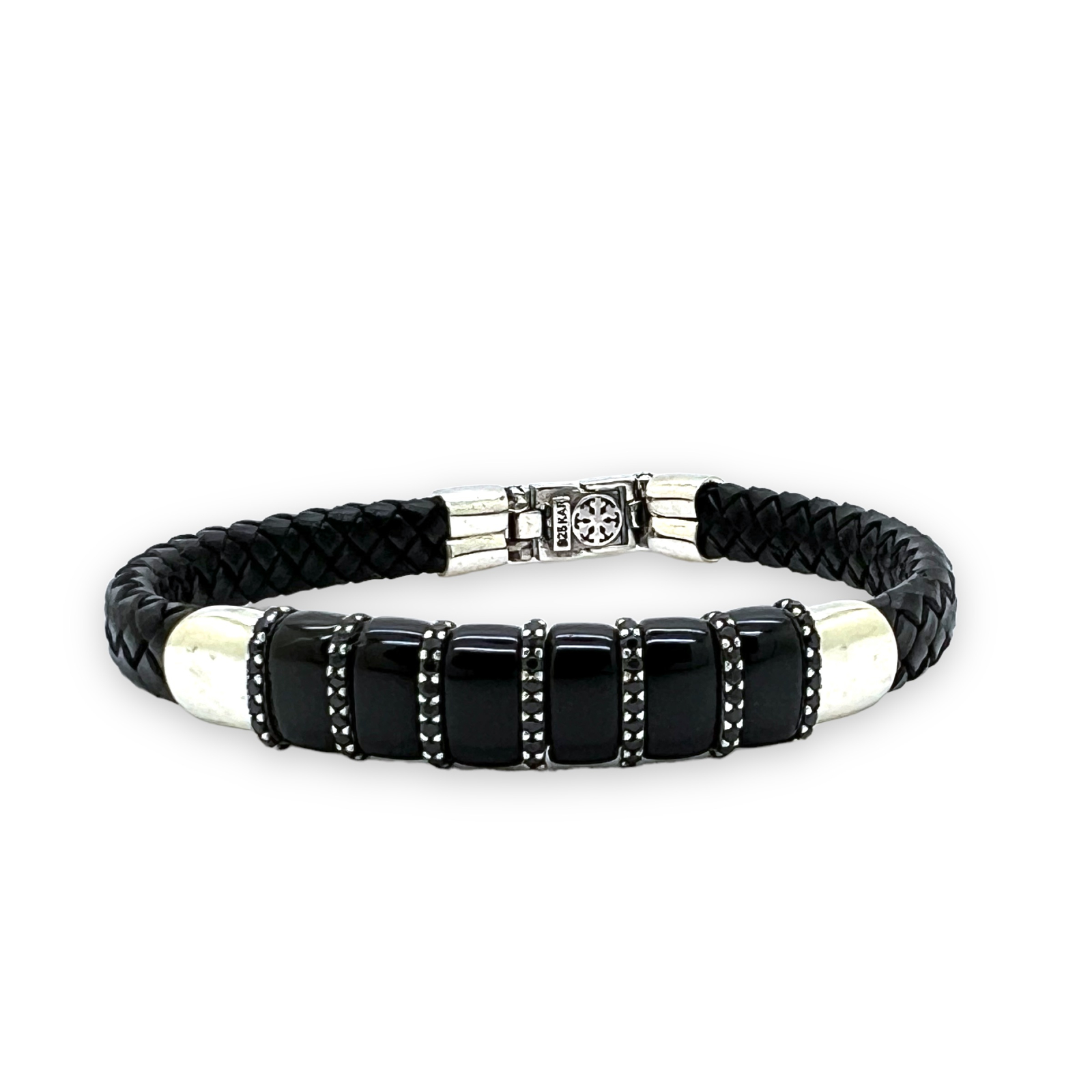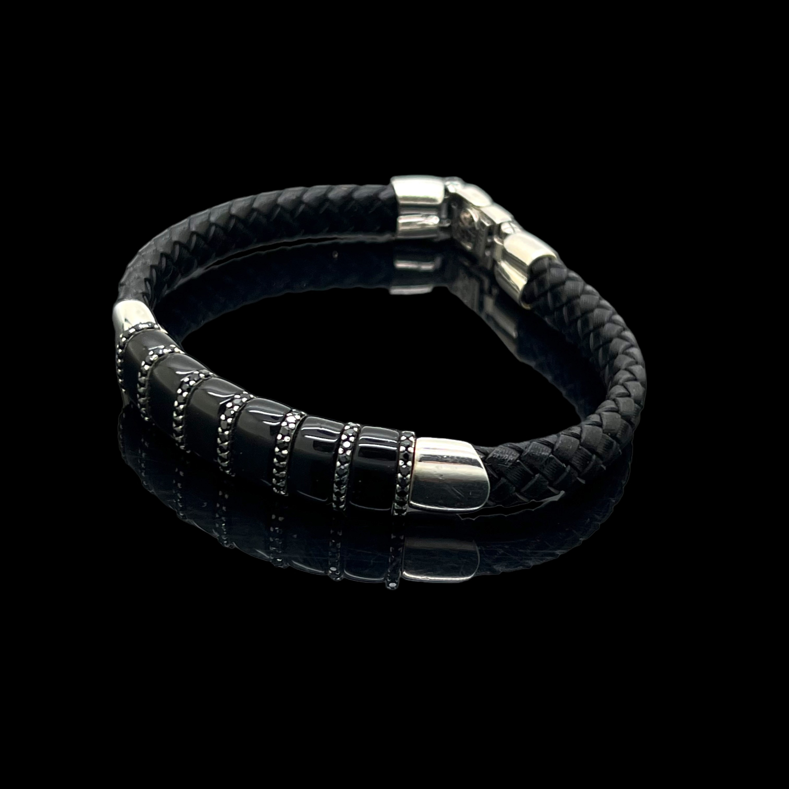 Bratara BrooksTip: Barbat.Materiale folosite :  -Argint 925 -Piele naturala -Cristale de zirconiu -Pietre naturale OnixCircumferinta : 20,5 cm.Latime: 7 mm.Poate fi purtata la incheieturi cu circumferinta intre 18 si 20 cm.Garantie: Da.Recomandare: purtata cu alte bratari sau langa un ceas.Bratara vine insotita de cutie."Be different!"